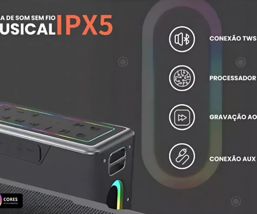 Certificação IPX5 – À prova d’água e sem fio Aprovado pela Anatel Use sem preocupação em ambientes externos como piscina, praia e camping Função Karaokê 2 microfones sem fio inclusos Som profissional para suas apresentações.