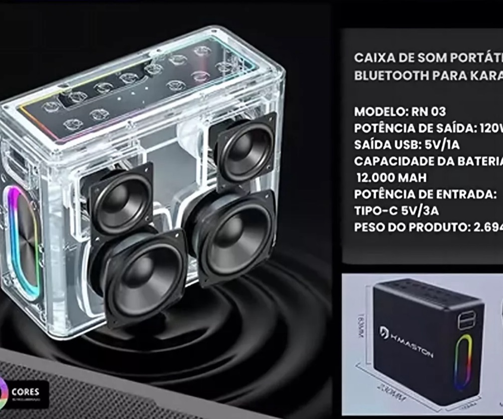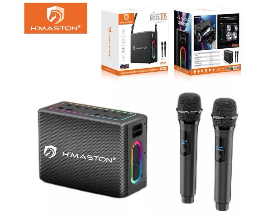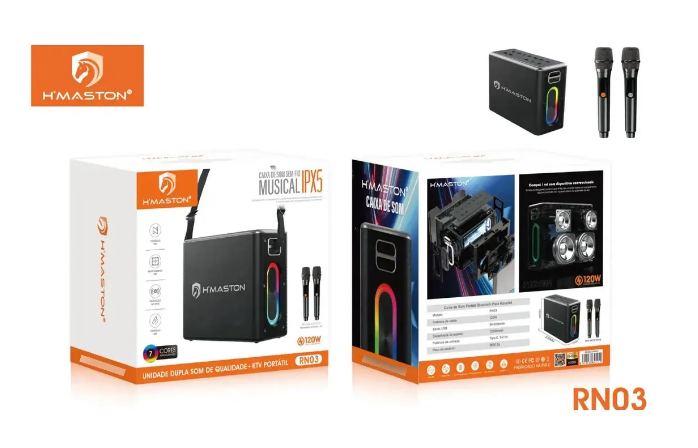 Caixa de Som Bluetooth Hmaston RN-03 – 120W com Karaokê Potência profissional, diversão garantida! A caixa de som Hmaston RN-03 combina qualidade e potência de 120W com recursos completos para karaokê, oferecendo uma qualidade de som excepcional.